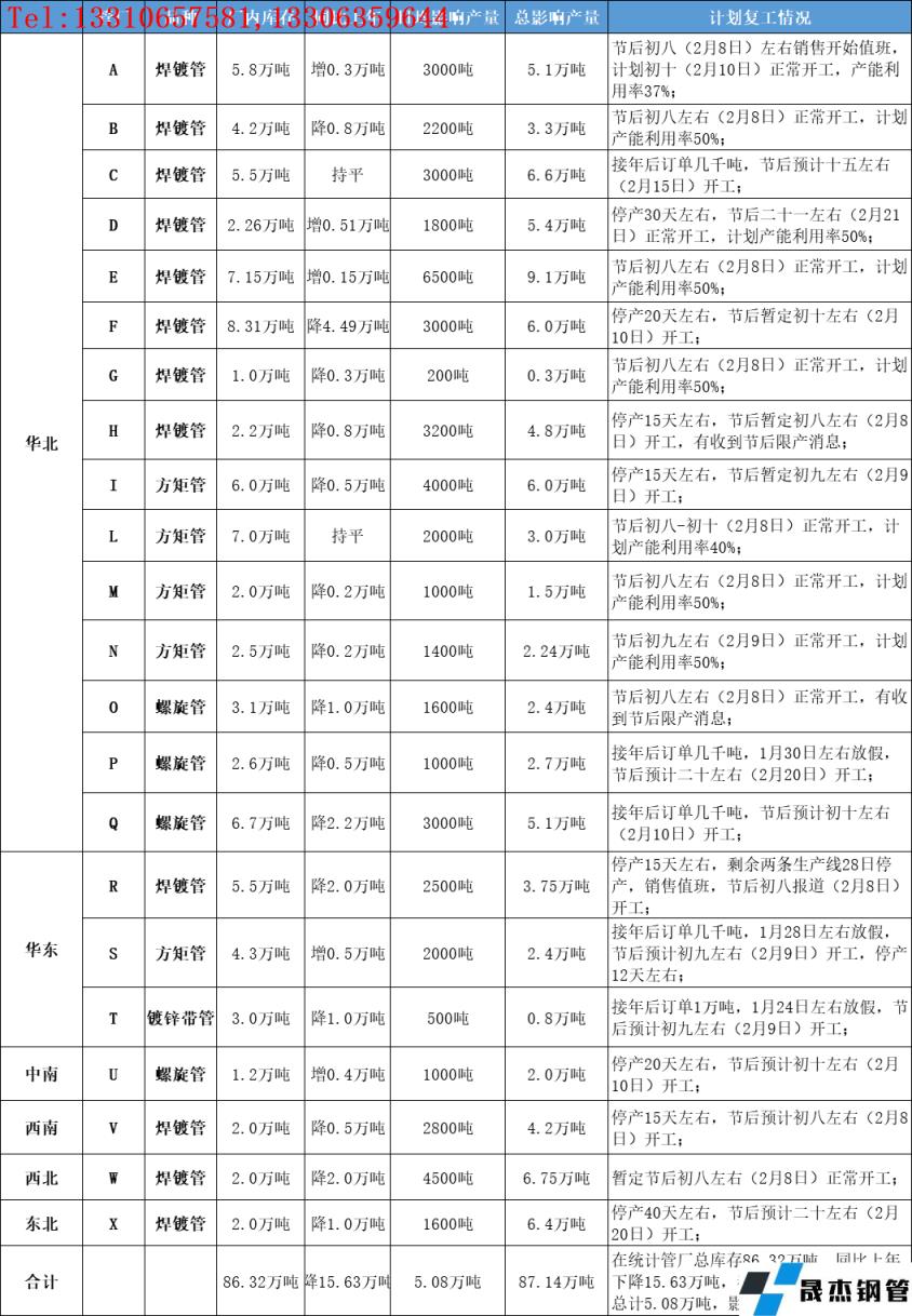 【停產(chǎn)】在統(tǒng)計焊接厚壁無縫鋼管管廠集中停產(chǎn)時間在臘月二十三(1月25日)至正月初八(2月8日)左右,平均停產(chǎn)時間17天,較去年縮短5天;最新統(tǒng)計管廠產(chǎn)能利用率40%左右,較去年春節(jié)前最后一次統(tǒng)計數(shù)據(jù)增長6.86個百分點;春節(jié)期間影響總產(chǎn)量87.14萬噸,較去年減少21.17萬噸,下降19.55%。