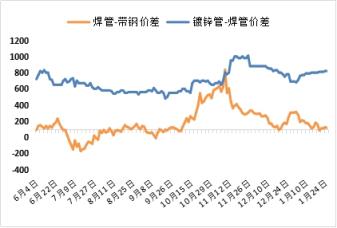 1月國內焊管、鍍鋅管價格先跌后穩(wěn)。據(jù)云商平臺監(jiān)測數(shù)據(jù)顯示,截至1月26日,全國4寸(3.75)國標焊管平均價格5331元,比上月同期下跌208元,全國4寸(3.75)鍍鋅管平均價格6286元,比上月同期下跌185元;全國50*50*2.5方管平均價格5268元,比上月同期下跌72元;全國219*6螺旋管平均價格5565元,比上月同期下跌202元。月中下旬焊鍍管市場反彈力度弱于上游(見圖1)。