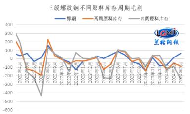圖2 三級(jí)螺紋鋼不同原料庫存周期毛利水平變化
