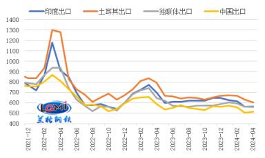 目前我國厚壁鋼管出口報(bào)價(jià)優(yōu)勢仍存。研究中心監(jiān)測數(shù)據(jù)顯示,截至2024年4月11日,印度、土耳其、獨(dú)聯(lián)體熱軋卷板出口報(bào)價(jià)(FOB)分別為560美元/噸、605美元/噸和565美元/噸,中國熱軋卷板出口報(bào)價(jià)(FOB)為515美元/噸;目前我國熱卷出口報(bào)價(jià)分別較印度、土耳其、獨(dú)聯(lián)體熱卷出口報(bào)價(jià)低45美元/噸、90美元/噸和50美元/噸(詳見圖4)。