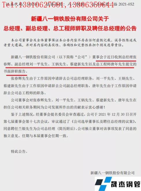 2021年12月31日,八一鋼鐵發(fā)布公告,董事會(huì)于近日收到沈東新先生辭去董事長(zhǎng)職務(wù),張志剛先生、姜振峰先生辭去董事職務(wù)的書(shū)面辭職報(bào)告。總經(jīng)理張春輝、副總經(jīng)理劉一平先生、王炳先生、蔡建新先生以及總工程師唐年先生提交書(shū)面辭職報(bào)告。
