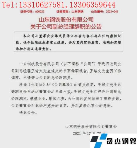 12月27日,山東鋼鐵發(fā)布公告,公司于近日收到公司副總經(jīng)理王培文提交的書(shū)面辭職報(bào)告,王培文因工作調(diào)整,申請(qǐng)辭去公司副總經(jīng)理職務(wù)。