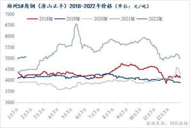 從近五年價格來看,2021年整體價格較往年明顯抬升,以鄭州5#角鋼(唐山正豐)為例,2021年均價較2020同期上升36.96%,最高點為五月份6550元/噸,比2020年十二月份峰值高1950元/噸。進入本月,河南地區(qū)型鋼價格小幅上漲,1月份雖然河南多地疫情頻發(fā),交通運輸管控加嚴,下游采購進度受限,整體需求表現(xiàn)不佳,但受到原材料鐵礦及環(huán)保政策等因素的影響,價格趨強運行。截止目前,河南疫情得以有效控制,考慮到春節(jié)假期過后,下游逐步復(fù)工,需求好轉(zhuǎn),預(yù)計市場價格有一定上漲空間。