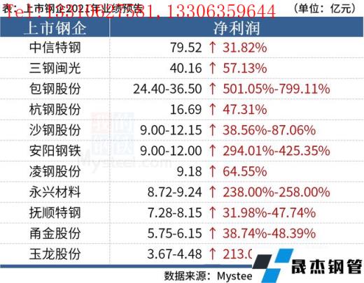 免責(zé)聲明:本網(wǎng)站(山東聊城晟杰無縫鋼管廠www.abagaf.com)刊載的“2021年鋼企利潤創(chuàng)新高,中信特鋼實現(xiàn)凈利近80億”等均源于網(wǎng)絡(luò),版權(quán)歸原作者所有,且僅代表原作者觀點,本文所載信息僅供參考。轉(zhuǎn)載僅為學(xué)習(xí)與交流之目的,如無意中侵犯您的合法權(quán)益,請及時聯(lián)系刪除。本網(wǎng)站刊登此篇文章并不意味著本站贊同其觀點或證實其內(nèi)容的真實性,我們不對其科學(xué)性、嚴(yán)肅性等作任何形式的保證。如果侵犯了您的版權(quán),請盡快聯(lián)系我們予以撤銷,謝謝合作!