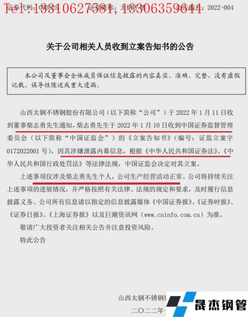 1月12日晚間,“不銹鋼龍頭”太鋼不銹發(fā)布公告稱,公司于2022年1月11日收到董事柴志勇先生通知,柴志勇先生于2022年1月10日收到中國證券監(jiān)督管理委員會(huì)的《立案告知書》(編號(hào):證監(jiān)立案字0172022001號(hào)),因其涉嫌泄露內(nèi)幕信息,根據(jù)相關(guān)法律法規(guī),中國證監(jiān)會(huì)決定對其立案。