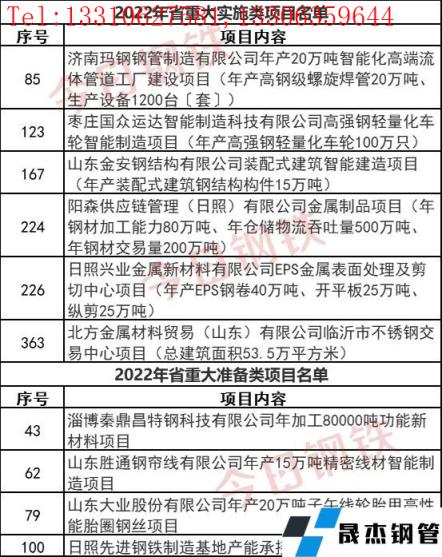 2022年1月20日,山東省人民政府發(fā)布《關(guān)于下達2022年省重大項目名單的通知》。此次通知中公布的600個項目中,涉及重大實施類項目449項,重大準備類項目151項。其中涉及到日照先進鋼鐵制造基地產(chǎn)能承接一期項目、濟南瑪鋼厚壁無縫鋼管制造有限公司年產(chǎn)20萬噸智能化高端流體管道工廠建設(shè)項目等10個鋼鐵相關(guān)項目。
