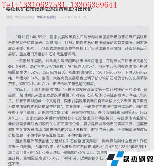 2月14日,中鋼協(xié)官微發(fā)布《要讓鐵礦石市場(chǎng)違法違規(guī)者真正付出代價(jià)》的文章,文章措辭嚴(yán)厲,強(qiáng)勢(shì)打壓。文章指出:我們有理由相信,國(guó)家發(fā)展改革委此次的一系列行動(dòng),必然會(huì)讓違法違規(guī)的投機(jī)鉆營(yíng)者真正付出代價(jià)。我們期待,鐵礦石市場(chǎng)自此回歸理性。