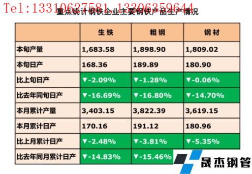 2月24日訊,2月中旬,重點(diǎn)統(tǒng)計(jì)鋼鐵企業(yè)共生產(chǎn)粗鋼1898.9萬噸、生鐵1683.58萬噸、厚壁鋼管1809.02萬噸。其中,粗鋼日產(chǎn)189.89萬噸,環(huán)比下降1.28%;生鐵日產(chǎn)168.36萬噸,環(huán)比下降2.09%;厚壁鋼管日產(chǎn)180.9萬噸,環(huán)比下降0.06%。厚壁鋼管庫存量1690.35萬噸,比上一旬增加4.95萬噸,增長0.29%;比去年同期減少64.38萬噸,下降3.67%。