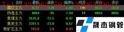 今日螺紋主力期貨跌138,收報(bào)4637,跌幅2.89%;熱卷主力跌95,收報(bào)4804,跌幅1.94%;焦煤主力跌12.5,收報(bào)2635,跌幅0.47%;焦炭主力跌23,收報(bào)3391.5,跌幅0.67%;鐵礦石主力漲3,收報(bào)703,漲幅0.43%。