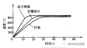 ▲圖7采用矩形感應(yīng)器整體一次感應(yīng)加熱淬火時,半軸表面的均溫加熱曲線由于在有效圈A端圓?。ㄒ妶D6) 上鑲有硅鋼片導(dǎo)磁體,所以法蘭根部圓角部位升溫較快,加熱均溫時間長,保證了該處的硬化層深和足夠的硬化區(qū)域。采用整體一次感應(yīng)加熱淬火還能提高花鍵齒頂?shù)挠捕取2捎镁匦胃袘?yīng)器加熱時,由于感應(yīng)器和零件之間間隙較大(一般為5~8mm),所以升溫慢,加熱時間長,硬化層厚且均勻。半軸回火也可采用矩形感應(yīng)器加熱,采用15~20℃/s的升溫速度,控制感應(yīng)加熱回火溫度在(250±10)℃范圍內(nèi),可以使半軸表面硬度控制在52~63HRC的范圍內(nèi),性能良好。