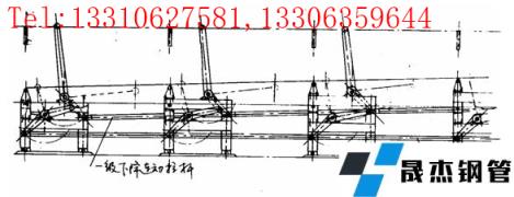 厚壁鋼管離開(kāi)水槽將自行濃動(dòng)到第一級(jí)下降機(jī)構(gòu)的固定梁上,然后被第一級(jí)下降機(jī)構(gòu)的活動(dòng)梁接收,第一級(jí)下降機(jī)構(gòu)在液壓缸操作下使連桿帶動(dòng)全部活動(dòng)梁運(yùn)動(dòng),將厚壁鋼管送到第二級(jí)下降機(jī)構(gòu)的固定梁上,然后通過(guò)同樣的動(dòng)作方式將厚壁鋼管送至管排收集臺(tái)架上。厚壁鋼管被第一級(jí)下降機(jī)構(gòu)送到第二級(jí)下降機(jī)構(gòu)的固定梁的過(guò)程中,由于厚壁鋼管在長(zhǎng)度方向上下降的高度不同,因而使厚壁鋼管傾斜,使管中殘留的水排出。但通過(guò)第二級(jí)下降機(jī)構(gòu)送至收集臺(tái)架時(shí),由結(jié)構(gòu)決定使厚壁鋼管下降高度在長(zhǎng)度方向恢復(fù)了平衡。這樣厚壁鋼管就可以很穩(wěn)定地進(jìn)入精整鋸切區(qū)域。