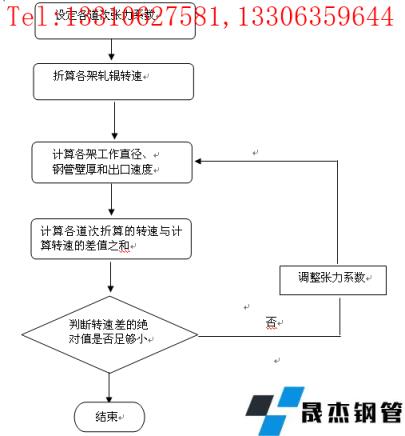 計(jì)算方法是:首先根據(jù)給定的主輔電機(jī)轉(zhuǎn)速折算出各道次軋輥轉(zhuǎn)速(公式1),然后設(shè)定各道次張力系數(shù)。由于孔型尺寸是一定的,所以設(shè)定好各道次的張力系數(shù)后,根據(jù)公式(2,3)可以計(jì)算出各道次軋輥的工作直徑和各道次軋后的厚壁鋼管壁厚。據(jù)此,可以計(jì)算出各道次厚壁鋼管的延伸系數(shù)和出口速度(公式4),然后再根據(jù)出口速度和軋制直徑計(jì)算各道次軋輥轉(zhuǎn)數(shù)(公式5)。如果設(shè)定的張力系數(shù)不合適,那么,計(jì)算出的軋輥轉(zhuǎn)數(shù)與根據(jù)主、輔電機(jī)轉(zhuǎn)數(shù)折算出的軋輥轉(zhuǎn)數(shù)就會出現(xiàn)差值。此時(shí), 可采用各道次轉(zhuǎn)數(shù)差的絕對值之和作為是否終止計(jì)算的依據(jù)。如果此數(shù)值達(dá)到足夠小,便可以終止計(jì)算。圖1為用計(jì)算機(jī)進(jìn)行道次壁厚計(jì)算的框圖。