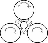 阿塞爾軋管機(jī)(ASSEL Mill)的三個軋輥在機(jī)架中呈120度角布置,與長芯棒構(gòu)成一個相對封閉的環(huán)狀孔型。軋輥軸線相對于軋制中心線垂直方向和水平方向均傾斜于一定角度,分別叫喂入角和輾軋角。軋輥形狀呈錐形,中間段有一個凸起叫做輥肩,軋制時與長芯棒完成集中變形,實(shí)現(xiàn)較大的壓下量,延伸系數(shù)可達(dá)2左右。