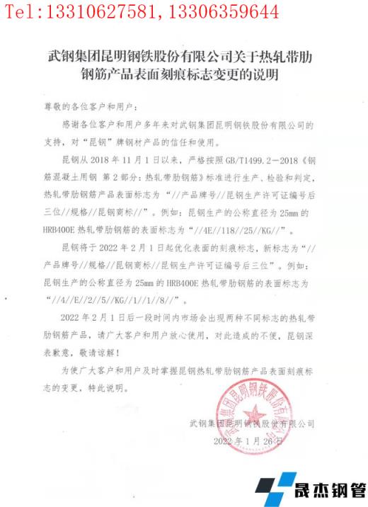 為使廣大客戶和用戶及時(shí)掌握昆鋼熱軋帶肋鋼筋產(chǎn)品表面刻痕標(biāo)志的變更,特此說(shuō)明。