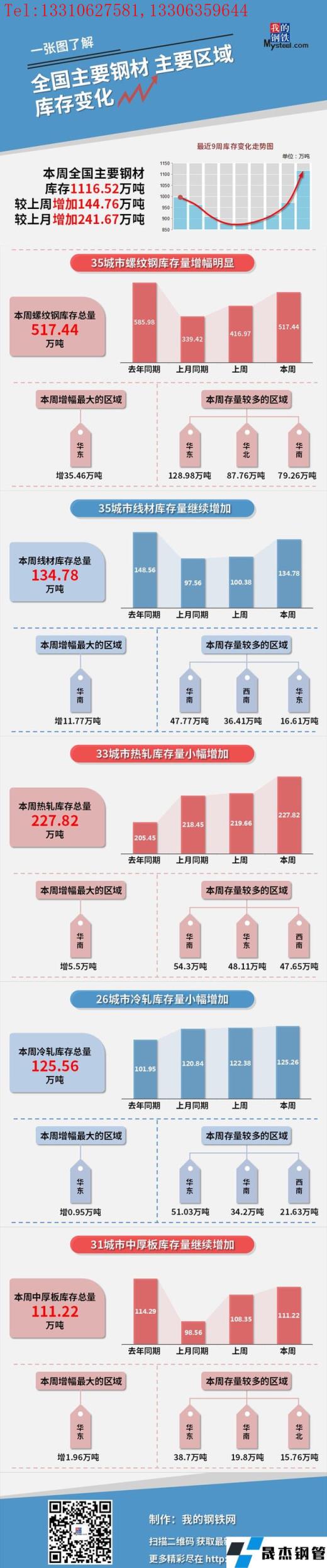 本周,全國主要鋼材社會(huì)庫存1116.52萬噸,較上周增加144.76萬噸,較上月增加241.67萬噸;螺紋鋼庫存總量517.44萬噸。
