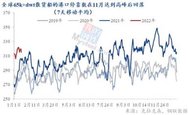 根據(jù)調(diào)研,10月份全球鐵礦石發(fā)運出現(xiàn)了大幅下降,10月環(huán)比降幅達5.8%至1.33億噸,傳導(dǎo)至12月中國海運鐵礦石進口環(huán)比下滑18%,至8500萬噸左右,同比下降11%,至近19個月低點。盡管12月鐵礦石發(fā)運回暖,但是由于10月以及11月運輸需求的下滑,多余運力需要被消化:太平洋板塊率先開始持續(xù)傳導(dǎo)下行壓力,致使租金價格下跌;西澳大利亞至中國C5航線運費于12月10日出現(xiàn)大幅下跌,跨太平洋C10航線也于當周緊跟下行趨勢。市場上租家也看空海岬型船海運市場:12月中國至巴西的C14空載航線同樣下跌。與此同時,圣誕節(jié)假期期間也導(dǎo)致了交易節(jié)奏放緩,此外,許多租家也都想盡可能規(guī)避卷土重來的新冠疫情及相關(guān)港口規(guī)定。往后進入2022年1月,國際干散貨海運市場正式步入淡季。