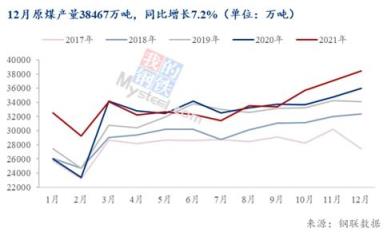 2021年我國原煤產(chǎn)量整體呈現(xiàn)前低后高走勢,尤其10月份增產(chǎn)保供、引導(dǎo)煤價回歸合理區(qū)間以來,我國原煤產(chǎn)量連續(xù)三個月屢創(chuàng)年內(nèi)新高。2021年第四季度原煤合計生產(chǎn)11.1億噸,約占全年產(chǎn)量27.3%,其中12月生產(chǎn)原煤3.8億噸,約占全年產(chǎn)量9.5%,保供增產(chǎn)效果顯著。