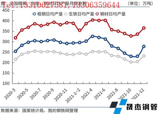 12月份,全國粗鋼日均產(chǎn)量278.04萬噸,環(huán)比大增20.3%,超過市場預(yù)期。一方面,由于11月份鐵礦石、焦炭等原燃料價格大幅下跌,12月份無縫鋼管廠家生產(chǎn)成本明顯下降,效益好轉(zhuǎn)推升擴產(chǎn)意愿。另一方面,2021年全國粗鋼產(chǎn)量壓減工作提前完成,為此12月份各地?zé)o縫鋼管廠家普遍出現(xiàn)復(fù)產(chǎn)。