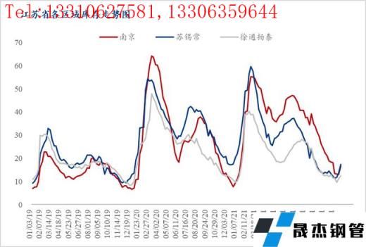 如上圖所示,2020年1月23日省會(huì)南京市場(chǎng)庫(kù)存占全省現(xiàn)貨庫(kù)存的21%左右,屬全年較低水平;而4月9日前后基本占全省庫(kù)存的41%;20年上半年南京市場(chǎng)庫(kù)存均保持較高水平,而下半年開始庫(kù)存便逐漸走低,蘇錫常庫(kù)存累庫(kù)增加。2021年1月8日南京庫(kù)存占全省庫(kù)存的24%,從4月初開始到本年度結(jié)束,南京庫(kù)存占比基本維持在40-42%左右,11月5日占比最高達(dá)到年度最高值,約50/%。2021年全年,南京市場(chǎng)庫(kù)存均保持較高水平,僅在年初階段,蘇錫常總庫(kù)存略高于南京。整體來看,今年南京市場(chǎng)現(xiàn)貨資源一直處于相對(duì)充裕的狀態(tài),且部分無縫厚壁鋼管廠家?guī)齑媲耙埔彩潜WC該市場(chǎng)建材供給較為穩(wěn)定的重要因素,而徐通揚(yáng)泰區(qū)域則因價(jià)格波幅巨大,市場(chǎng)參與者主動(dòng)囤貨意愿不高,全年庫(kù)存相較去年小幅減量。