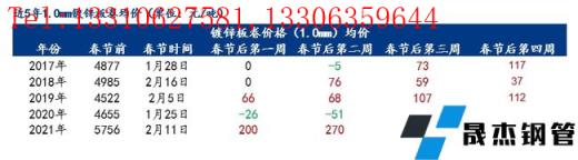 重慶鍍鋅:市場仍處于休市狀態(tài),多數(shù)貿(mào)易商暫未開工。重慶1.0*1250*C有花鍍鋅板卷主流無縫厚壁鋼管廠家報價5600元/噸,較節(jié)前并未有變化。由于本地無縫厚壁鋼管廠家檢修,無縫厚壁鋼管廠家資源投放量有所減量,春節(jié)期間預(yù)估增加2000噸。貿(mào)易商整體庫存壓力尚可承受,對于節(jié)后行情信心較足。