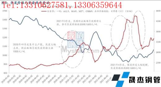 2)而2021年雖沒有再出現(xiàn)2020年4季度集中大幅去產(chǎn)能的情況。但仍出現(xiàn)了2021年三季度焦炭價(jià)格大漲1600元/噸的情形,兩個(gè)半月漲幅48%,漲幅明顯高于2020年四季度。這主要是由于焦煤供應(yīng)受限導(dǎo)致的煤價(jià)大漲推升焦炭成本大幅上漲,以呂梁低硫主焦煤來看,其價(jià)格從6月底至9月底漲了一倍(2050-4100元/噸),焦炭供應(yīng)矛盾從產(chǎn)能約束轉(zhuǎn)移至原料供應(yīng)受限。同樣的,2021年四季度后,國家出臺(tái)煤炭保供政策,原料供應(yīng)大幅緩解,同時(shí)需求端鐵水產(chǎn)量大減,最終傳導(dǎo)至焦煤價(jià)格大跌,焦炭價(jià)格應(yīng)聲回落1600元/噸。