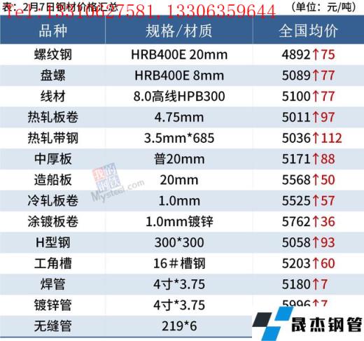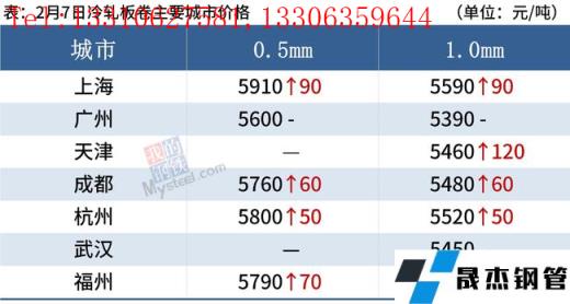 冷軋板卷:2月7日,全國24個(gè)主要城市1.0mm冷卷均價(jià)5525元/噸,較節(jié)前(1月30日)上漲57元/噸。據(jù)市場反饋,今日大部分鋼貿(mào)企業(yè)未全面復(fù)工,大部分陸續(xù)要8-10號(hào)陸續(xù)進(jìn)入復(fù)工,當(dāng)前市場暫無明顯成交,受原材料價(jià)格提漲,冷軋貿(mào)易商先提漲價(jià)格,市場呈有價(jià)無市狀態(tài)?;久婵矗刂?號(hào)調(diào)研數(shù)據(jù)顯示,冷軋無縫厚壁鋼管廠家產(chǎn)能利用率79.10%,周環(huán)比減少2.31%;廠庫周環(huán)比增加7.16萬噸,社庫周環(huán)比增加8.45,月環(huán)比增加12.30萬噸,年同比增加14.03萬噸,基本面壓力尚可。預(yù)計(jì)8日全國冷軋板卷現(xiàn)貨價(jià)格多震蕩上調(diào)為主。