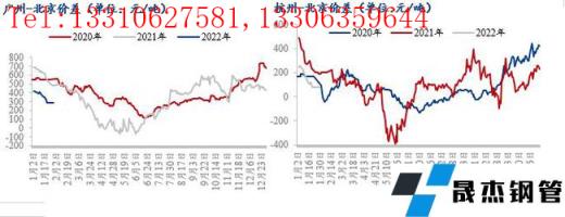 1月份廣州、杭州市場市場價格漲幅緩慢,北京市場價格漲幅居前,因此廣州-北京、杭州-北京市場的區(qū)域價差均有所收窄。目前廣州-北京價差在300元/噸左右,此價差略低于2020年、2021年同期水平,且結(jié)合無縫厚壁鋼管廠家的政策以及運費來看此價差也不足以吸引北方區(qū)域資源南下廣州。目前杭州-北京價差不足100元/噸,因北京價格相對高位,加之東北區(qū)域節(jié)后需求啟動較晚,因此東北區(qū)域部分無縫厚壁鋼管廠家傾向于把資源投放至北京區(qū)域,其中西林、新?lián)徜撋踔劣诤v味加写税才拧?/p>