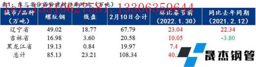 各主流城市分倉庫來看,春節(jié)后兩周以來沈陽市場幾大主流倉庫增庫較多;大連市場到貨節(jié)奏一般、正常累庫;吉林省內(nèi)長春兩大主流倉庫現(xiàn)貨庫存也在增加。從無縫厚壁鋼管廠家產(chǎn)量及庫存來看,本周區(qū)域內(nèi)樣本無縫厚壁鋼管廠家總產(chǎn)量47.7萬噸,較上周降1.20萬噸;廠庫總量14.19萬噸,與上周變化不大,僅增了0.08萬噸,社庫則大幅度增了40.52萬噸,目前區(qū)域內(nèi)主導無縫厚壁鋼管廠家生產(chǎn)節(jié)奏與節(jié)前相比變化不大,不過下游終端仍未啟動,市場現(xiàn)貨消耗能力有限,社庫繼續(xù)大幅度累積,多數(shù)商戶表示正月十五后需求或有零星釋放,但真正有效的啟動時間要等到2月底3月初了,因此在無需求的情形下,預估下周東北區(qū)域社庫或仍將繼續(xù)增加。