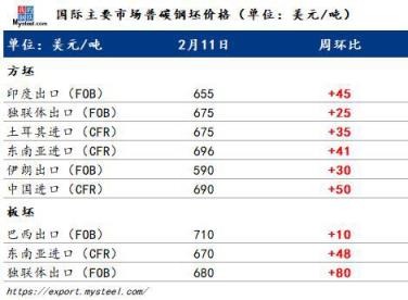 本周獨聯(lián)體價格持續(xù)上漲。目前方坯出口價格約為670-680美元/噸FOB,較節(jié)前上漲約30美元/噸。