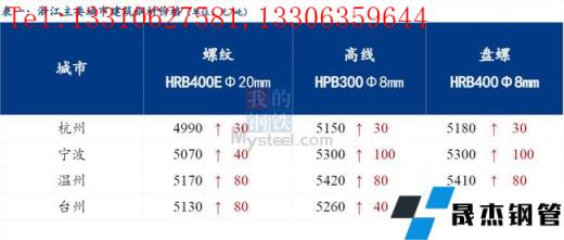 從浙江省今日價格來看,省內(nèi)價格有所上漲。其中杭州市場建筑厚壁無縫鋼管價格較昨日上漲30元/噸;寧波市場建筑厚壁無縫鋼管價格較昨日上漲40-100元/噸;溫州市場建筑厚壁無縫鋼管價格統(tǒng)漲80元/噸;臺州市場建筑厚壁無縫鋼管價格較昨日上漲40-110元/噸 。