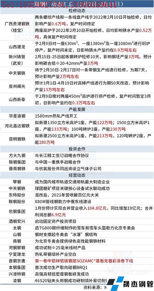 據(jù)不完全統(tǒng)計,本周(2月7日-2月11日)有6家無縫厚壁鋼管廠家發(fā)布檢修動態(tài),具體如下: