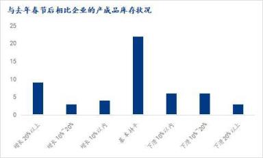 調(diào)研樣本企業(yè)中,相比去年春節(jié)后產(chǎn)成品庫(kù)存方面,增長(zhǎng)20%以上的企業(yè)占比16.98%,增長(zhǎng)10%-20%的企業(yè)占比5.66%,增長(zhǎng)10%以內(nèi)的占比為7.55%;與去年持平的企業(yè)占比41.5%;下滑10%以內(nèi)的企業(yè)占比11.32%,下滑10%-20%的企業(yè)占比11.32%,下滑20%以上的企業(yè)占比5.66%。