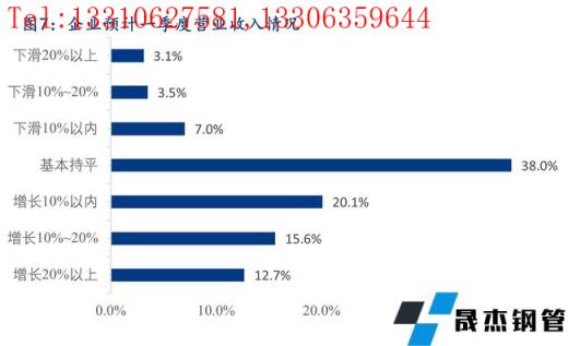3、對于一季度營業(yè)收入的情況,38.0%的企業(yè)預計一季度營業(yè)收入與去年同期基本持平,48.3%的企業(yè)預計一季度營業(yè)收入與去年同期相比有所增長,13.6%的企業(yè)一季度營業(yè)收入同比下降,其中預計一季度營業(yè)收入增幅20%以上及降幅20%以上的企業(yè)分別占比12.7%和3.1%。