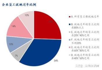 調研企業(yè)樣本中,所有員工都就地過年占比25.50%,就地過年的員工比例在80%以上占比33.70%,就地過年的員工比例在60%~80%之間占比13.75%,就地過年的員工比例在40%~60%之間占比9.76%,就地過年的員工比例在20%~40%之間占比7.10%,就地過年的員工比例不到20%占比10.20%。