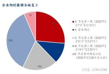 調研企業(yè)樣本中,對于全面復工的時間,節(jié)后第一周(2022年2月7日~2月13日)占比26.37%,節(jié)后第二周(2022年2月14日~2月20日)占比36.32%,節(jié)后第三周(2022年2月21日~2月27日)占比19.40%,節(jié)后第四周或以后(2022年2月28日及以后)占比6.47%,暫未確定占比11.44%。