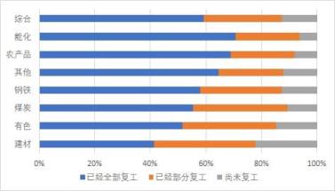 從未復(fù)工的企業(yè)調(diào)研情況來(lái)看,截至2月11日,計(jì)劃在2月7日-13日(節(jié)后第一周)復(fù)工的企業(yè)占比11.5%,計(jì)劃在2月14日-29日(節(jié)后第二周)復(fù)工的企業(yè)占比17.6%。預(yù)計(jì)節(jié)后兩周內(nèi),超九成企業(yè)都將完成復(fù)工,鋼鐵、能化、農(nóng)產(chǎn)品行業(yè)企業(yè)復(fù)工率預(yù)計(jì)達(dá)到93%以上。