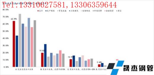 本地調(diào)研,我們還就企業(yè)是否有出口業(yè)務(wù)、出口業(yè)務(wù)比重有進(jìn)行了調(diào)研。 調(diào)研顯示,完全沒有出口業(yè)務(wù)的企業(yè)占比63.99%,有出口業(yè)務(wù),比重不到10%的企業(yè)占比19.82%,有出口業(yè)務(wù),比重在10%~20%的企業(yè)占比10.91%,有出口業(yè)務(wù),比重在20%~50%的企業(yè)占比3.68%,有出口業(yè)務(wù),比重在50%以上的占比只有1.60%。分行業(yè)來看,幾乎所有行業(yè)出口占比都比較低,其中生產(chǎn)企業(yè)整體要高于其他行業(yè)。