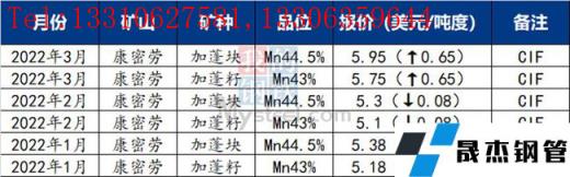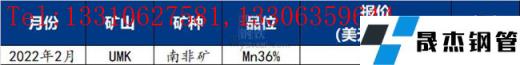 UMK2022年3月對華錳礦裝船報價Mn36南非半碳酸4.7美元/噸度,環(huán)比上漲0.2美元/噸度。