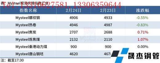 ◎ 2月24日統(tǒng)計(jì)新口徑114家無(wú)縫厚壁鋼管廠家進(jìn)口燒結(jié)粉總庫(kù)存3317.49萬(wàn)噸,燒結(jié)粉總?cè)蘸?5.47萬(wàn)噸。原口徑64家無(wú)縫厚壁鋼管廠家進(jìn)口燒結(jié)粉總庫(kù)存1568.97萬(wàn)噸,燒結(jié)粉總?cè)蘸?7.32萬(wàn)噸,庫(kù)存消費(fèi)比33,燒結(jié)礦中平均使用進(jìn)口礦配比86.39%,無(wú)縫厚壁鋼管廠家不含稅平均鐵水成本3107元/噸。詳情>>