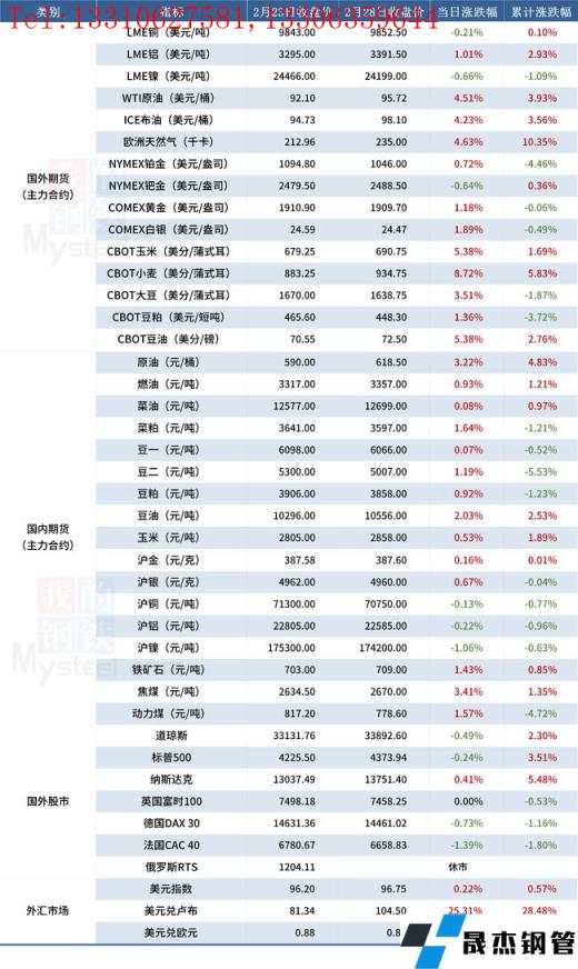 免責(zé)聲明:本網(wǎng)站(山東聊城晟杰無縫鋼管廠www.abagaf.com)刊載的“受近期局勢影響大宗商品價格一覽表(2月28日)”等均源于網(wǎng)絡(luò),版權(quán)歸原作者所有,且僅代表原作者觀點,本文所載信息僅供參考。轉(zhuǎn)載僅為學(xué)習(xí)與交流之目的,如無意中侵犯您的合法權(quán)益,請及時聯(lián)系刪除。本網(wǎng)站刊登此篇文章并不意味著本站贊同其觀點或證實其內(nèi)容的真實性,我們不對其科學(xué)性、嚴肅性等作任何形式的保證。如果侵犯了您的版權(quán),請盡快聯(lián)系我們予以撤銷,謝謝合作!