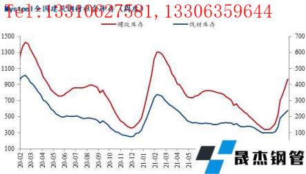 統(tǒng)計建筑厚壁無縫鋼管社會庫存總量為1205.15萬噸,月環(huán)比增加552.93萬噸,年同比減少334.69萬噸;其中螺紋鋼庫存965.28萬噸,月環(huán)比增加447.84萬噸,年同比減少256.68萬噸;線材庫存239.87萬噸,月環(huán)比增加105.09萬噸,年同比減少78.01萬噸。