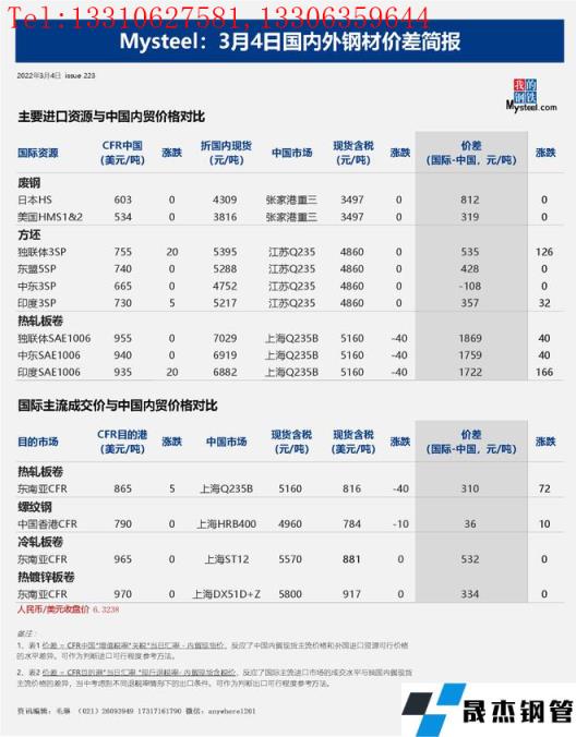 免責聲明:本網(wǎng)站(山東聊城晟杰無縫鋼管廠www.abagaf.com)刊載的“2022年03月04日日報:國內(nèi)外鋼材_無縫鋼管價差匯總(2022.3.4)”等均源于網(wǎng)絡,版權歸原作者所有,且僅代表原作者觀點,本文所載信息僅供參考。轉載僅為學習與交流之目的,如無意中侵犯您的合法權益,請及時聯(lián)系刪除。本網(wǎng)站刊登此篇文章并不意味著本站贊同其觀點或證實其內(nèi)容的真實性,我們不對其科學性、嚴肅性等作任何形式的保證。如果侵犯了您的版權,請盡快聯(lián)系我們予以撤銷,謝謝合作!