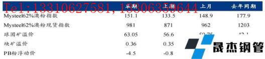 港口現(xiàn)貨與遠(yuǎn)期現(xiàn)貨方面:本周五62%澳粉指數(shù)151.1美元/噸,環(huán)比增加17.6美元/噸;62%澳粉現(xiàn)貨指數(shù)981元/噸,環(huán)比增加110元/噸; 65%球團(tuán)溢價(jià)指數(shù)為63.05美元/噸,環(huán)比漲6.45美元/噸; 62.5%塊礦溢價(jià)指數(shù)0.36美元/噸度,環(huán)比上漲0.02美元/噸度。本周PB粉遠(yuǎn)期浮動(dòng)溢價(jià)-4.5美元/噸,環(huán)比下跌3.70美元/噸。