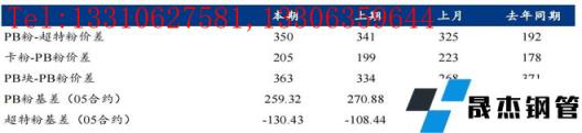 價(jià)差方面:本周高低品價(jià)差擴(kuò)大,截至周五青島港PB粉與超特粉價(jià)差350元/噸,環(huán)比擴(kuò)大9元/噸;巴西礦溢價(jià)減少,青島港卡粉與PB粉價(jià)差205元/噸,環(huán)比收窄6元/噸;粉塊價(jià)差收窄,青島港PB塊與PB粉價(jià)差363元/噸,環(huán)比收窄29元/噸。期現(xiàn)基差方面:PB粉基差259.32,環(huán)比走弱11.56;超特粉基差-130.43,環(huán)比走弱21.99。
