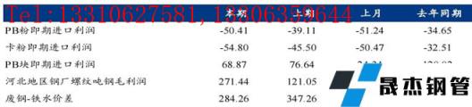 利潤(rùn)方面:截至周五,青島港PB粉即期進(jìn)口利潤(rùn)-50.41元/噸,環(huán)比下降11.3元/噸;青島港卡粉即期進(jìn)口利潤(rùn)-54.8元/噸,環(huán)比下降9.3元/噸;青島港PB塊即期進(jìn)口利潤(rùn)68.87元/噸,環(huán)比下降7.76元/噸。本期河北地區(qū)無(wú)縫厚壁鋼管廠家螺紋噸鋼毛利潤(rùn)271.44元/噸,環(huán)比增加150.4元/噸,廢鋼與鐵水價(jià)差284.26元/噸,環(huán)比收窄63元/噸。