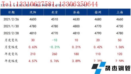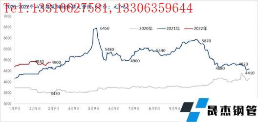 2月,山東建筑厚壁無(wú)縫鋼管價(jià)格窄幅震蕩上行。截至2月28日,山東建筑厚壁無(wú)縫鋼管價(jià)格(螺紋鋼為例)從上月跌4800元/噸上漲至4810元/噸,環(huán)比上漲10元/噸、漲幅0.2%。全月最高價(jià)格4930元/噸,最低價(jià)格4750元/噸,波動(dòng)幅度180元/噸。雖然2022年2月平均價(jià)格較去年上漲了392元/噸,較2020年上漲了1243元/噸,但是對(duì)比來(lái)看,今年2月震蕩幅度相對(duì)較小,價(jià)格要溫和的多。