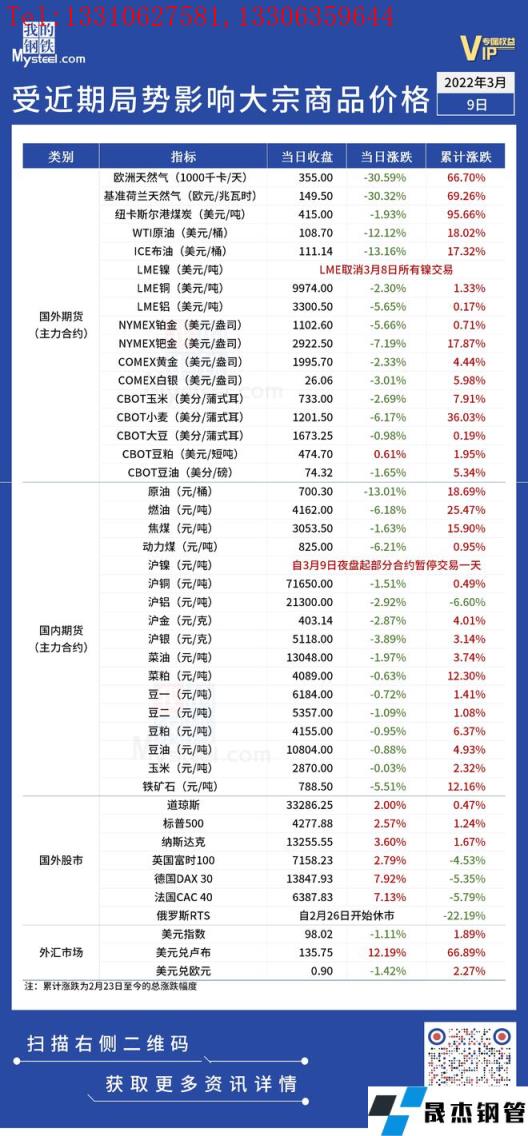 近期,受國際局勢影響,全球金融及大宗商品市場出現(xiàn)較大波動。3月9日,伴隨俄烏局勢出現(xiàn)緩和跡象,能源和有色金屬上演了行情“大反轉(zhuǎn)”,歐美股市則大幅上漲。匯總情況如下:
