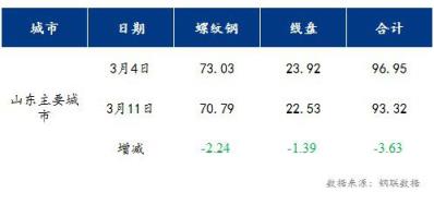 山東13個(gè)主要城市建筑厚壁無縫鋼管總庫存93.32萬噸,較上周減少3.63萬噸。其中,螺紋鋼70.79萬噸,較上周下降2.24萬噸,盤螺22.53萬噸,較上周下降1.39萬噸。