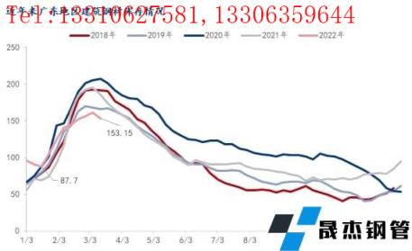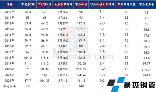 對(duì)比歷史數(shù)據(jù)來(lái)看,近10年來(lái)春節(jié)后廣州建筑厚壁無(wú)縫鋼管庫(kù)存峰值均出現(xiàn)第3-5周,累庫(kù)周期約24天左右;近5年來(lái)節(jié)后庫(kù)存累庫(kù)量明顯上升,節(jié)后峰值水平均超過(guò)150萬(wàn)噸以上,而2017年之前節(jié)后庫(kù)存峰值均在140萬(wàn)噸以內(nèi)。近年來(lái),隨著經(jīng)濟(jì)發(fā)展以及供應(yīng)擴(kuò)張,春節(jié)前市場(chǎng)主動(dòng)性冬儲(chǔ)積極性增加,整體的庫(kù)存量出現(xiàn)明顯上升; 雖然2022年節(jié)前價(jià)格偏高,但節(jié)前現(xiàn)貨價(jià)格上漲,帶動(dòng)市場(chǎng)不少商家主動(dòng)性囤貨、備貨,節(jié)前庫(kù)存總量并未出現(xiàn)明顯累庫(kù)現(xiàn)象。節(jié)后開(kāi)市,在疫情等因素影響下,累庫(kù)速度遠(yuǎn)低于去年,今年庫(kù)存呈現(xiàn)的特點(diǎn)是,累庫(kù)速度快,累庫(kù)量大,周期短等特點(diǎn)。同時(shí)再加上今年節(jié)后不少短流程企業(yè)并未完全恢復(fù)生產(chǎn),自然資源供應(yīng)量有所減量,節(jié)后累庫(kù)低于往年,且今年峰值出現(xiàn)在3月第1周,第二周迎來(lái)庫(kù)存拐點(diǎn)。