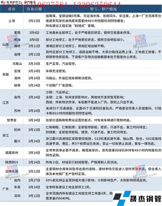 近期,全國疫情呈現(xiàn)局部高度聚集和多點(diǎn)散發(fā)態(tài)勢(shì),對(duì)國內(nèi)大宗商品市場(chǎng)的供應(yīng)端、需求端、物流及倉儲(chǔ)等方面都有不同程度的影響。據(jù)統(tǒng)計(jì),截至3月15日,全國多個(gè)省市發(fā)布停工停產(chǎn)情況。其中受疫情影響最大的吉林省于3月12日宣布,長(zhǎng)春市主要厚壁無縫鋼管倉庫暫停出庫,當(dāng)?shù)亟ú氖袌?chǎng)交投進(jìn)入暫時(shí)停滯狀態(tài),倉庫入庫及本地?zé)o縫厚壁鋼管廠家生產(chǎn)暫時(shí)正常。深圳市于3月12日宣布,全市范圍內(nèi)所有建設(shè)工地暫定停工排查4天,南山及福田區(qū)域厚壁無縫鋼管市場(chǎng)預(yù)計(jì)共影響需求量約6640噸。與此同時(shí),全國其他地區(qū)鋼貿(mào)交易也受到影響,部分工地開始停工,物流運(yùn)輸暫停服務(wù)。具體情況如下: